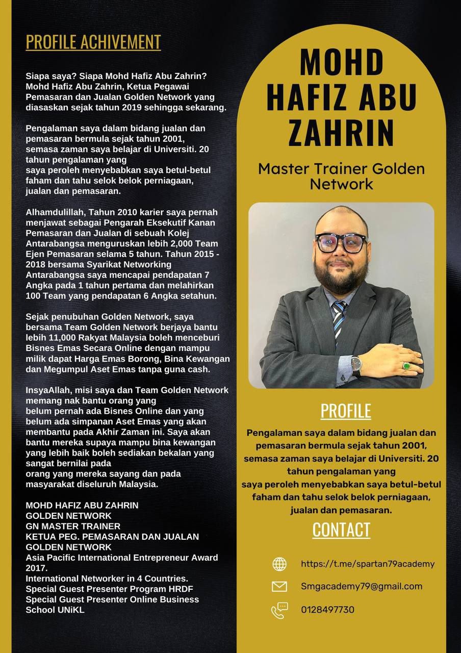 Siapa sava? Siapa Mohd Hafiz Abu Zahrin? Mohd Hafiz Abu Zahrin, Ketua Pegawai Pemasaran dan Jualan Golden Network yang diasaskan sejak tahun 2019 sehingga sekarang.